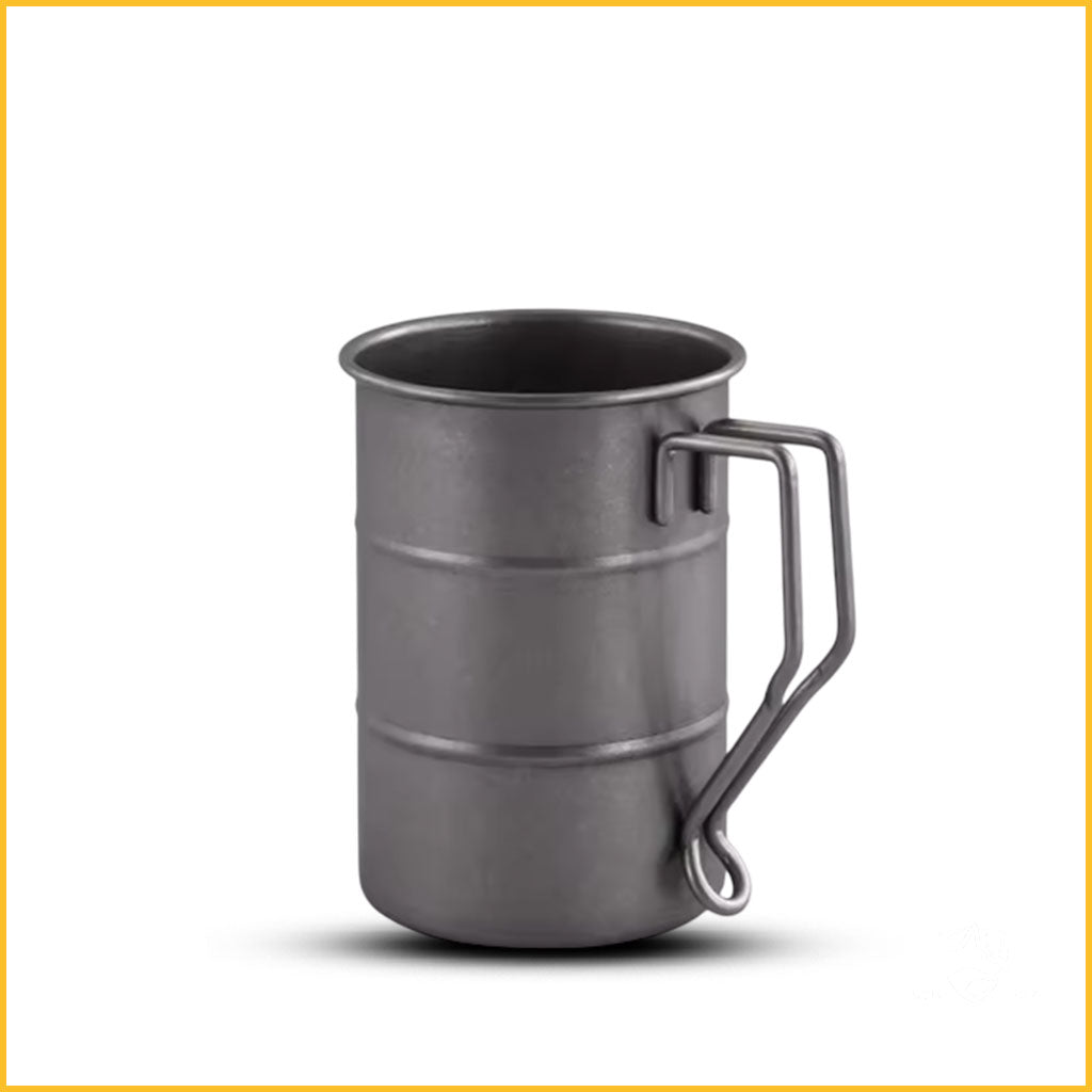 Zeitloser Outdoor Becher aus 304 Edelstahl: leicht, robust, geschmacksneutral. Mit griffigem Henkel für heiße und kalte Getränke vom ersten Kaffee am Lagerfeuer bis zum Tee am Abend.