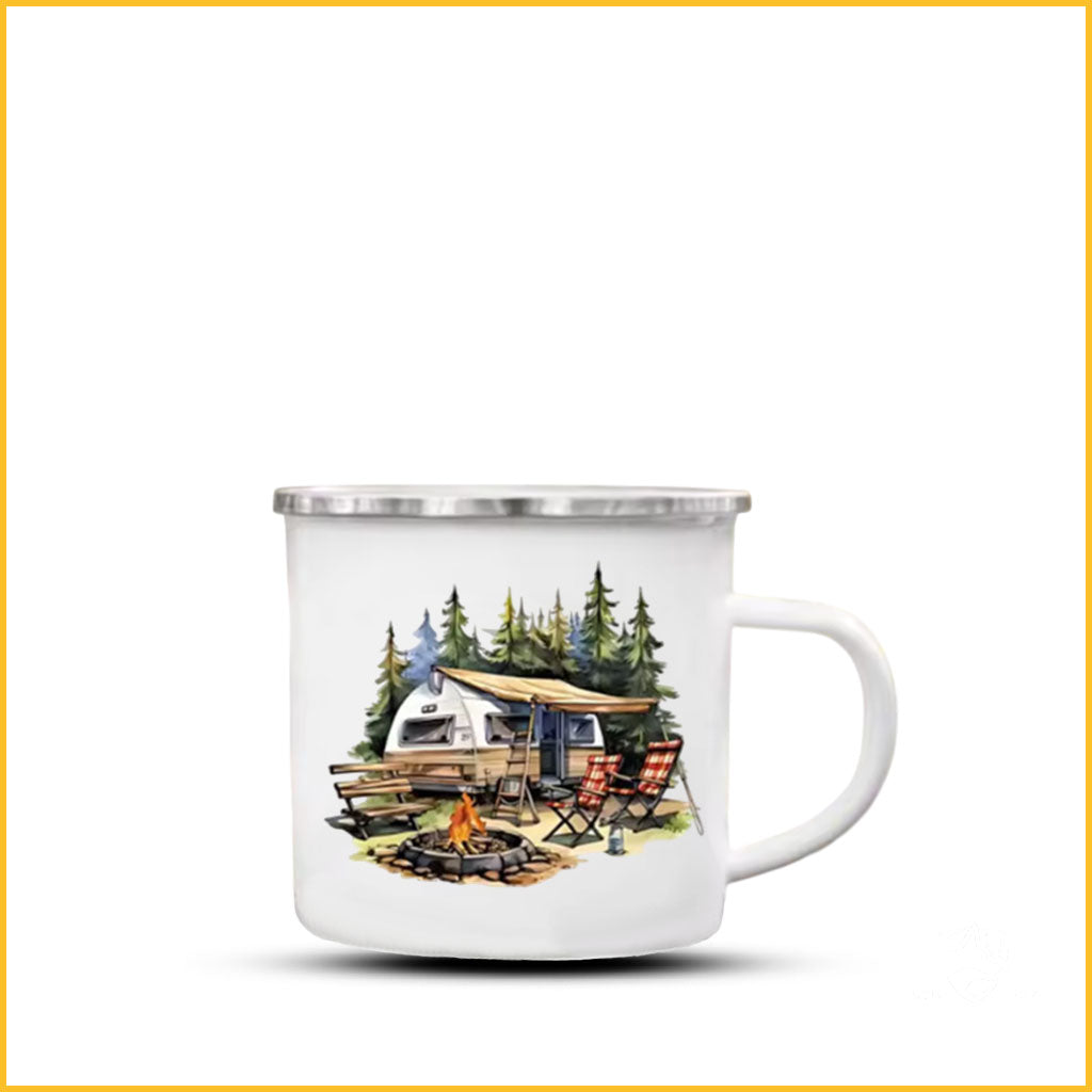 Leichte, robuste Emaille Tasse mit nostalgischem Camping-Motiv. Optimal für Outdoor, Camping, Vanlife oder den gemütlichen Kaffee zu Hause. Weiß mit silbernem Rand, 360 ml Fassungsvermögen.